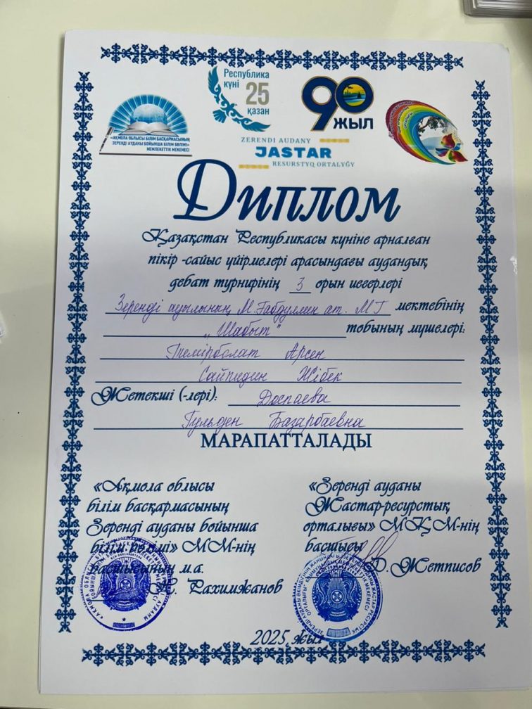 Қазақстан Республикасы күніне орай пікір-сайыс ."Шабыт"тобы ІІІ-орын.Құттықтаймыз!