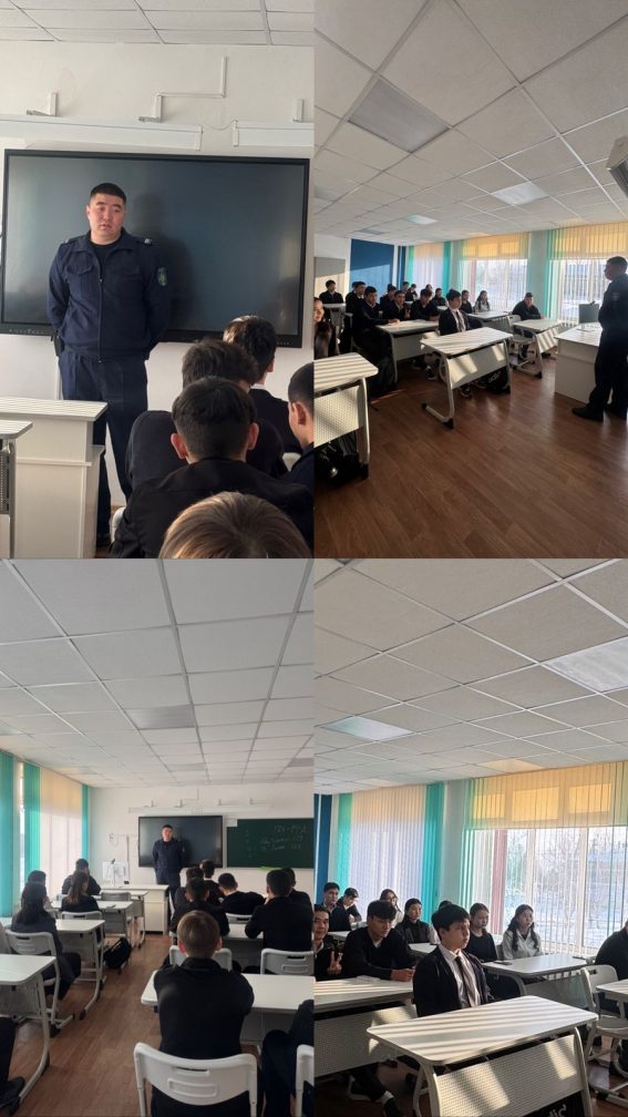 Мектебіміздің 10-11-сынып оқушыларымен Ішкі істер мамандандырылған қызмет өкілдері "Заң мамандығы"тақырыбы бойынша кездесу өткізді. Ондағы мақсат: «Заң мамандығының» қыр-сырларымен таныстыру, Ішкі істер мамандандырылған қызмет өкілдерінің кәсіби қызметі арқылы құқық қорғау саласындағы мамандықтардың маңызын түсіндіру, оқушылардың құқықтық сауаттылығын арттыру және болашақ мамандықты саналы таңдауға бағыт-бағдар беру. Кәсіби бағдар беру педагогы: Б.Абдильманова